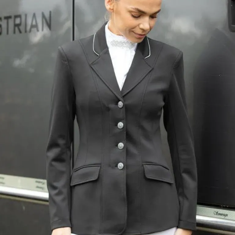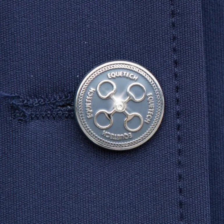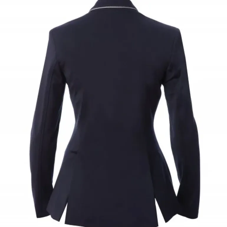 Classical tailored competition jacket with modern elements. Made from durable knitted ponte fabric with 5% Lycra added stretch and shape retention. Other features include fancy metallic piping to collar, Equetech exclusive crystal button, double back vents, darted contoured sleeves and concealed zip pockets. Machine washable.