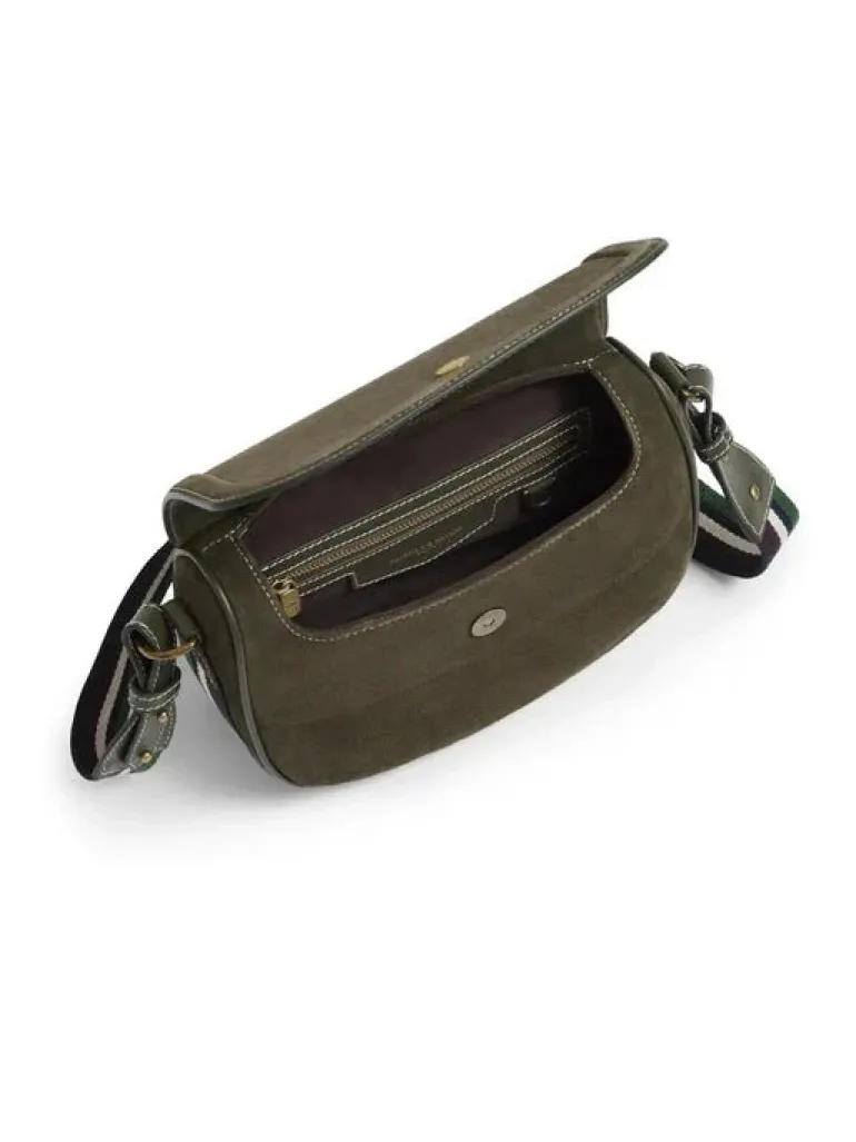 Our new Boston collection brings a pop of colour to summer days with plum, cream and forest green striped webbing that evokes sunny weekends watching Wimbledon and getting out into nature. With its striped strap and oh-so-soft suede, this cartridge bag finishes off your warm weather wardrobe with impeccable style. Pair with our Boston Drivers and a crisp white shirt dress for a look that has ‘August Bank Holiday’ written all over it.