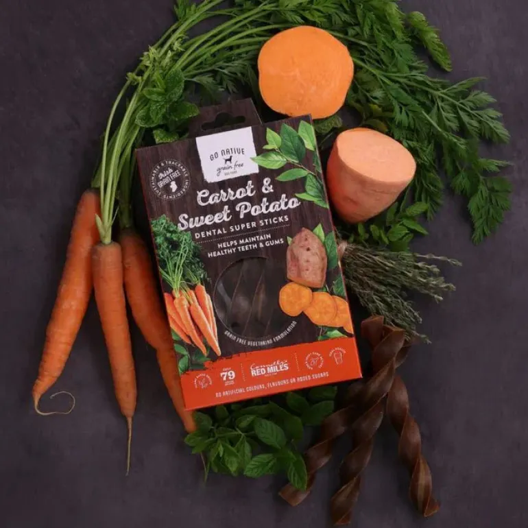 Carrot & Sweet Potato Dental Sticks Grain-free, plant-based Go Native Dental Supersticks are crafted with care for your dog’s daily oral health. Packed with superfood ingredients, they help clean teeth, reduce tartar and keep bad breath at bay.