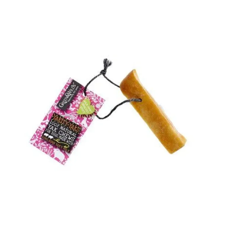 Yakity Yak dog chews are hand crafted from a blend of 100% Yaks/cows milk with a little lime and salt and then smoked to form a hard, tasty, cheesy chew. The Himalayan people (and their dogs!) have been enjoying these tasty snack chews for generations.
