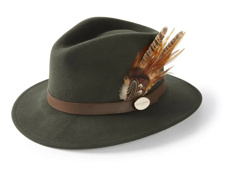 The stunning wool felt Suffolk Fedora is hand finished with a cluster of natural feathers fastened behind a branded leather band.