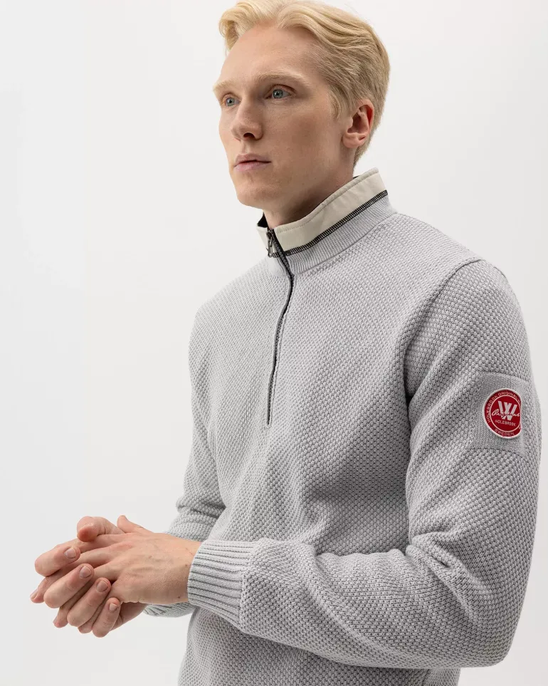 Wind-lined knitted sweater 100% cotton. Structured knit with woven details on the collar. Short zipper and normal to generous fit. Ribbed cuffs at the bottom and at the sleeve ends. The sweater has a windproof elastic lining consisting of 96% polyester and 4% elastane. No chemicals are used to achieve the windproof function. Instead, the lining is manufactured with a special weaving technique that makes the fabric extremely tightly woven and therefore also windproof, while the fabric breathes. The elastane makes the fabric stretchy, which means that it stops the wind but not movement. The lining is labelled with ÖKO-tex® Standard 100, which guarantees that the fabric is free from harmful substances. Sustainably produced in Europe.