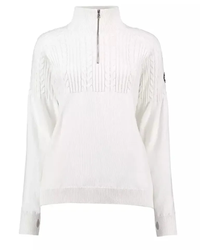 Windproof classic knitted sweater in soft cotton. T-neck collar and short metal zipper. Cable knitted at the upper part and ribbed details at cuffs, collar and bottom. Practical holes for your thumbs.