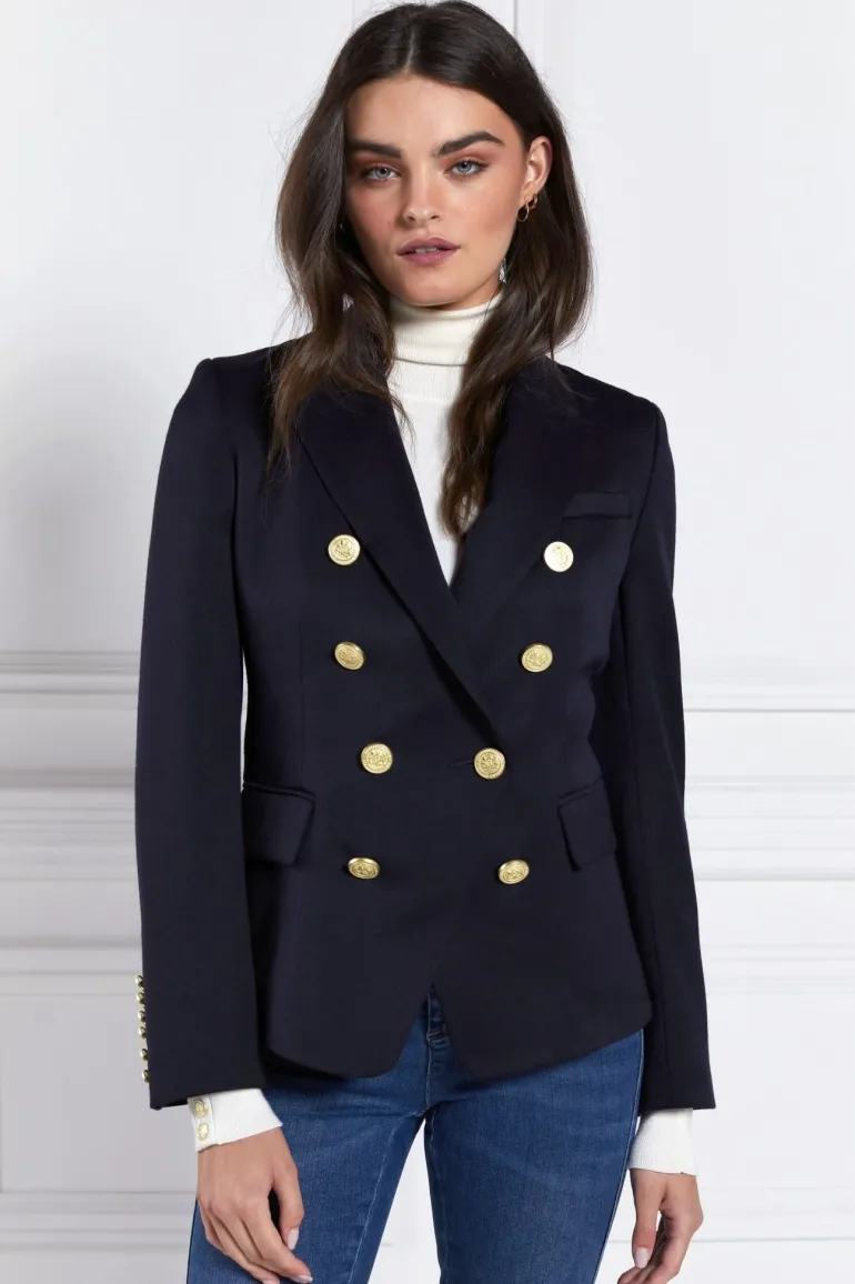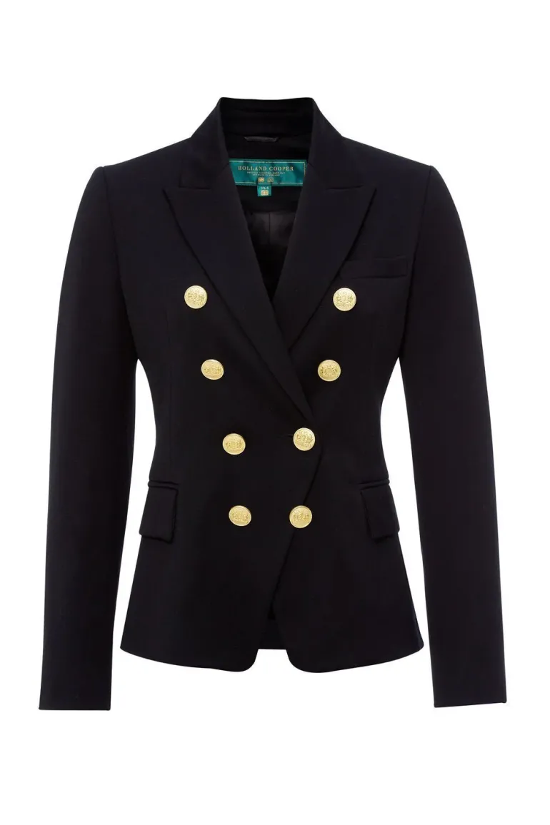 This double breasted blazer is a chic transeasonal wardrobe essential. Designed to create a sharp tailored silhouette worn open or closed. Fully lined with a luxury stretch lining for extra comfort and adorned with HC signature gold buttons on the front and cuffs. This blazer has been hand cut and made entirely in England using wools woven in the UK.
