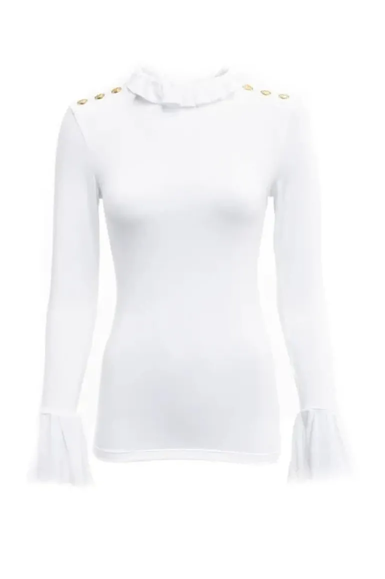 Created from a flawless and smooth fabric for a second-skin feel, this tee has been designed to become an everyday essential in your wardrobe. Designed with a body-contouring fit with a pretty ruffle neckline and cuffs, this piece is both flattering and elegant. Detailed with HC rivets on the shoulders.