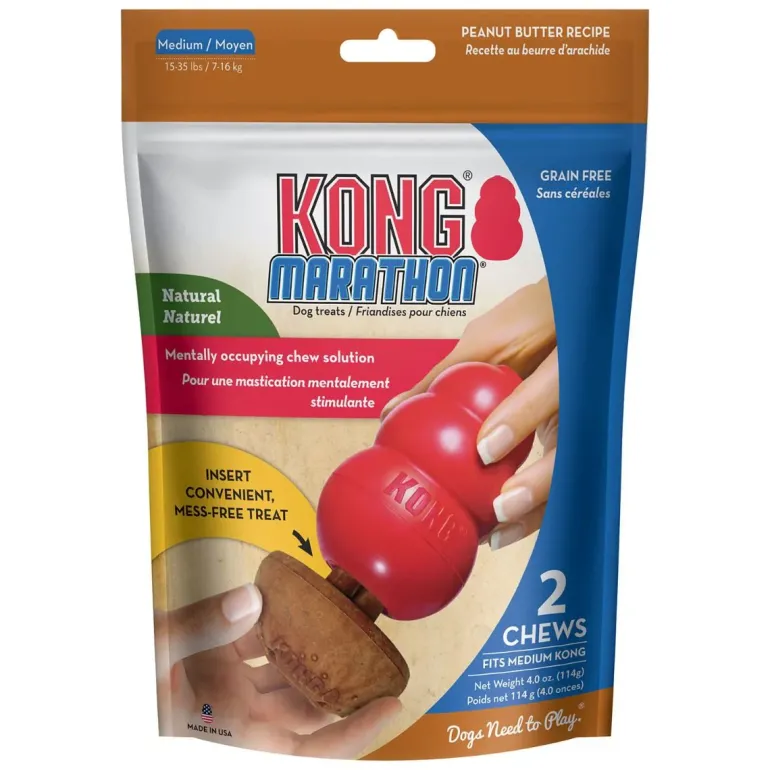 The KONG Marathon treat provides a mentally occupying chew solution. Ideally sized to fit within KONG Classic rubber toys, this convenient, mess free treat is packed full of fun. As a starter, flavor nubs ignite natural chewing instincts, then the robust exterior continues the engagement, finally the edible prongs entice foraging instincts as they drop into the toy once the exterior is chewed. KONG Marathon is natural, grain-free and proudly made in the USA. Placing the treat on the KONG is easy, just simply push and twist the treat to lock it on the KONG and unleash the treating extravaganza.