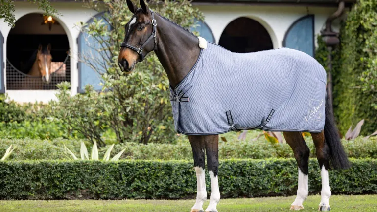 The Kudos Bamboo Cooler is known for its hexagonal pattern and distinctive suede effect trim that adds a touch of luxury. Whether used during travel, while in the box, or for post-workout recovery, this rug showcases LeMieux’s expertise in technical design. Featuring a soft bamboo blend outer fabric, Simuwool wither protection, and an anti-static and anti-bacterial shoulder lining, this rug effectively cools the key muscle groups after exercise. The angled T-bar front closure, hook and loop fastener, and cross surcingles provide additional security while the silicone dipped tail fillet cord adds a practical finishing touch.