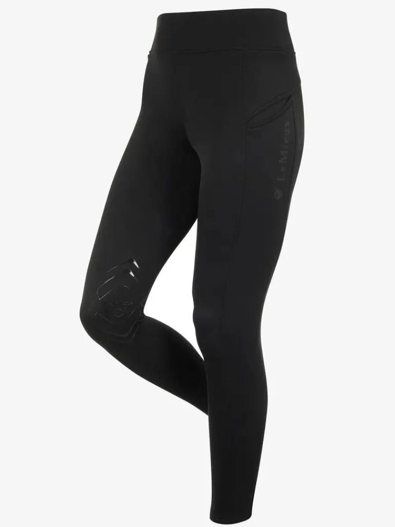 A silicone knee grip pattern adds security and grip when riding while elasticated phone pockets on the thighs are super handy to keep belongings safe. Finished with smart LeMieux branding and tapered lower legs