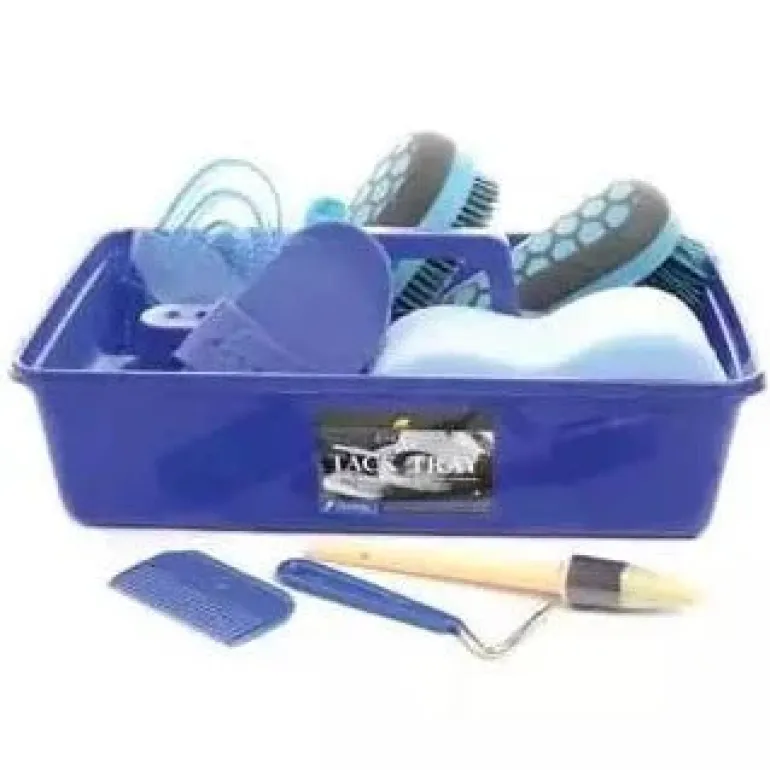 Contains: Blue Tack Tray, Body Brush, Dandy Brush, Hoof Oil Brush, Dog Bone Sponge, Hoof Pick, Mane Comb, Plastic Curry Comb, Synthetic Curry Comb, Water Brush.
