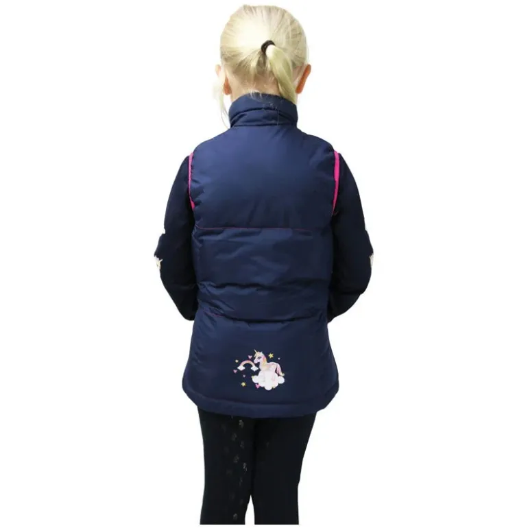 Unicorns, unicorns and more unicorns! This padded gilet is part of the Little Unicorn collection and features the unicorn character to the chest and to the rear. The stand-up collar will protect your Little Rider’s from the elements, and the padded body will keep them warm. Finished with pink stitching, front pockets and two way zip. Looks fantastic when paired with other items from the Little Unicorn range.