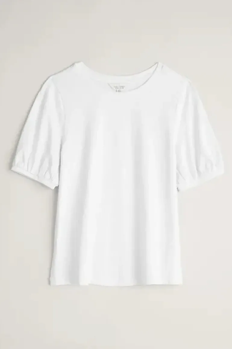 A simple round neck T-Shirt, with gathers at the shoulders and cuffs of the sleeves to give a subtle blouson shape. Made from midweight organic cotton. We love this style worn loose over a skirt, and to add interest under summer pinafores.