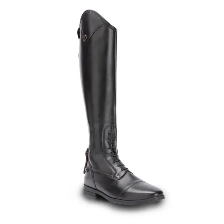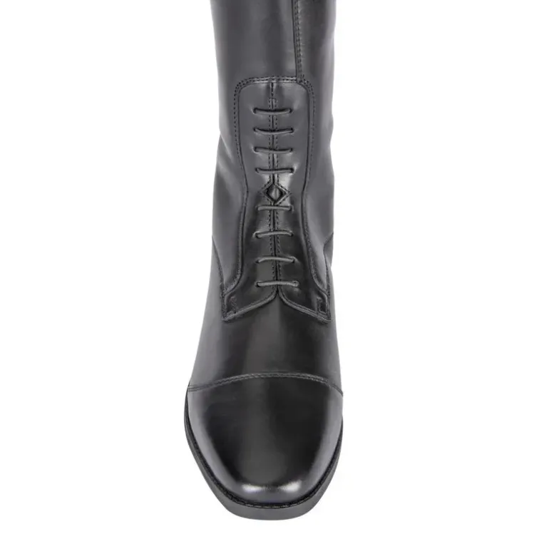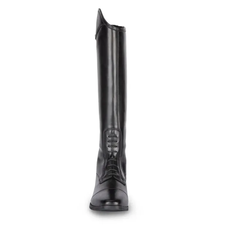 Lift your competition look with the sleek lines and elegant detail of Ortona long riding boots. The short height leg is specially shaped for a neat profile. Expertly constructed in smooth shape retaining leather, smartly polished to a high sheen finish making them ideal for the arena. The YKK® zip system offers a free running close fit with a contoured shape, zip guards give a tidy finish and protect against wear. A carefully engineered square toe and stretch mock laces offer classic style. Leather covered UltraFit panels sculpt the calf, dressage cut tops further enhance the shape for an elongated leg look.