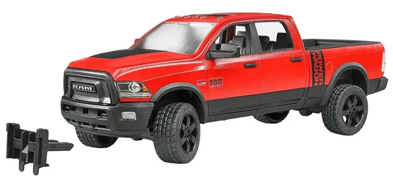 The Ram 2500 power wagon is a heavy-duty pick-up truck by Ram Trucks. Its durability and off-road capabilities are legendary. Just like the real thing, the toy features a crew cab with four doors. All doors open to accommodate four Profi-Serie figures (available separately). It also features suspension on both axles to provide ride comfort and off-road capability. The front axle can be steered using the included steering wheel extension. The tailgate opens to transport loads and the loading area provides space for Bruder pallets, pallet cages or straw bales (accessories 02415/02342, available separately). The ram can also be used to pull the horse box (available separately). So horses can be taken almost anywhere, be it to the paddock or to a ride out with friends.