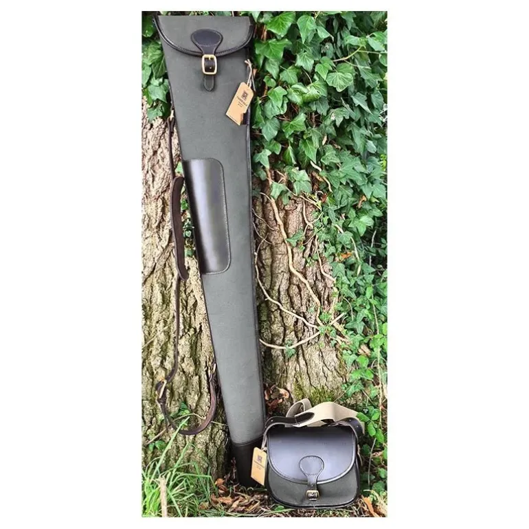Top quality woven canvas with suede lining. leather top flap. Features quick load hinge, leather and brass fittings and wide comfortable sling. For 100 cartridges