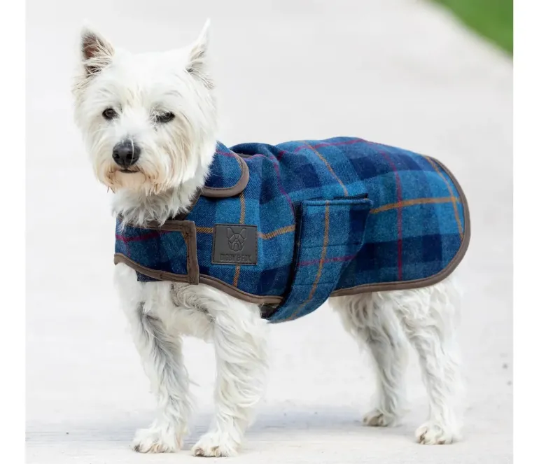 Classic countryside style for man’s best friend, a smart tweed coat for the town or country dog. Harness compatible and lined with fleece for ultra-cosy comfort. Touch close chest fastening and belly flap, elastic hind leg straps, fold back collar.