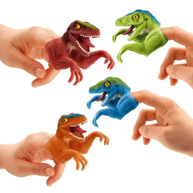 Wobbly dino fun: The predatory dinosaur finger puppets made of soft plastic material can be made to wobble by moving them. Available in orange, red, green and blue.
