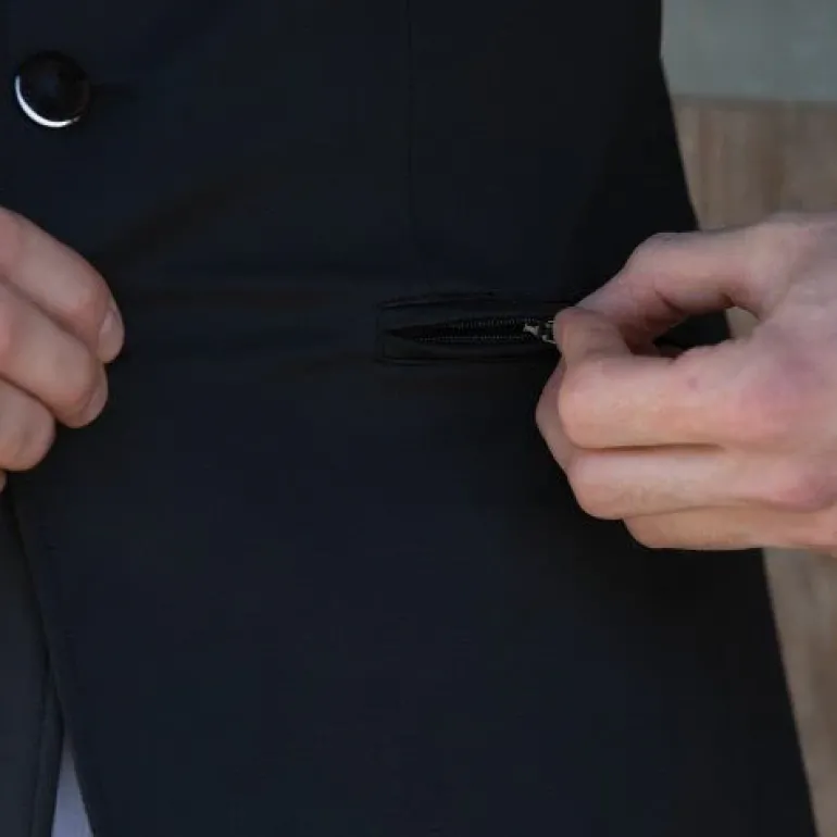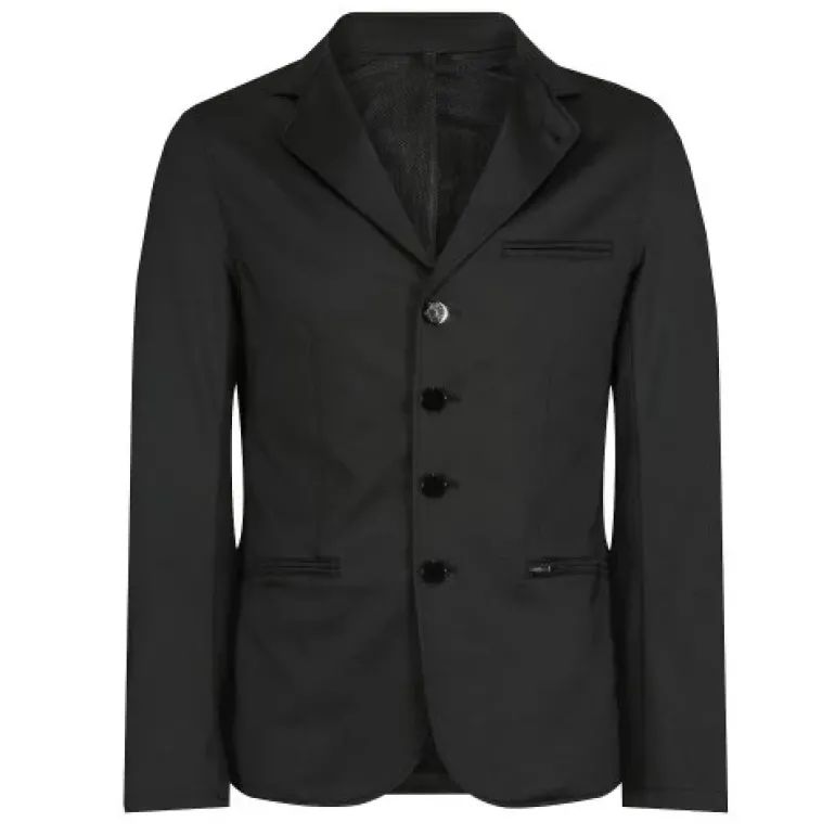 This sporty mens riding jacket has been designed in our new technical stretch fabric, with a durable finish and ventilation eyelets under the arm for reliable sweat absorption. Unlined sleeves ensure optimum comfort in the saddle! Other features include mesh lined torso, double-vented back and hidden zip fastening with sleek button to front, faux chest pocket and two zip pockets to front. This fantastically low maintenance jacket is tailored to feel like your favourite blazer and is styled with a durable knitted Ponte fabric with 6% spandex for superb stretch and shape retention. Machine washable. 94% Polyester / 6% Spandex