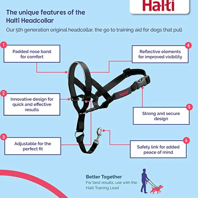 - REFLECTIVE & SAFE: every Halti Headcollar has reflective accents for improved visibility in low light and a safety link that attaches to your dog’s collar for complete peace of mind.