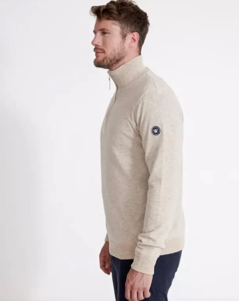 Knitted windproof sweater in 100% soft merino wool. Rib knit collar with zip and rib knitted endings.