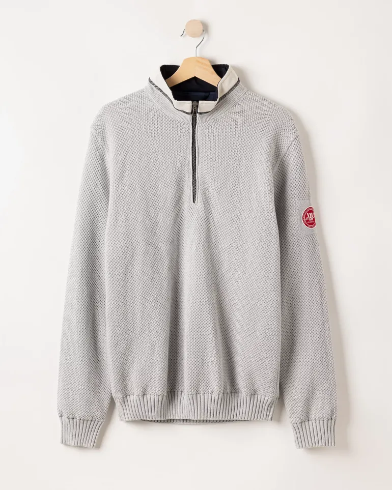 Wind-lined knitted sweater 100% cotton. Structured knit with woven details on the collar. Short zipper and normal to generous fit. Ribbed cuffs at the bottom and at the sleeve ends. The sweater has a windproof elastic lining consisting of 96% polyester and 4% elastane. No chemicals are used to achieve the windproof function. Instead, the lining is manufactured with a special weaving technique that makes the fabric extremely tightly woven and therefore also windproof, while the fabric breathes. The elastane makes the fabric stretchy, which means that it stops the wind but not movement. The lining is labelled with ÖKO-tex® Standard 100, which guarantees that the fabric is free from harmful substances. Sustainably produced in Europe.