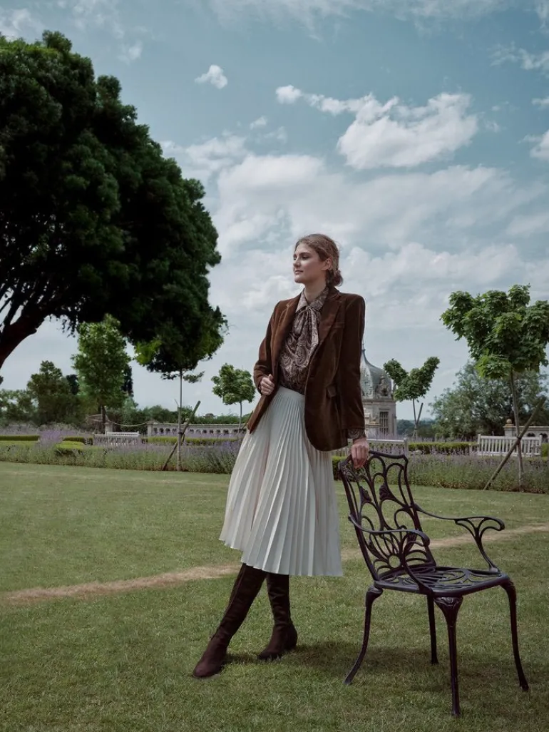 Hunt & Hall’s blazer has been tailored from plush cotton-velvet that takes on color so beautifully. It’s cut for a slim fit and has padded shoulders for structure. Style it with our beautiful Housham blouse and a pair of jeans or with a cream pleated skirt this festive season .