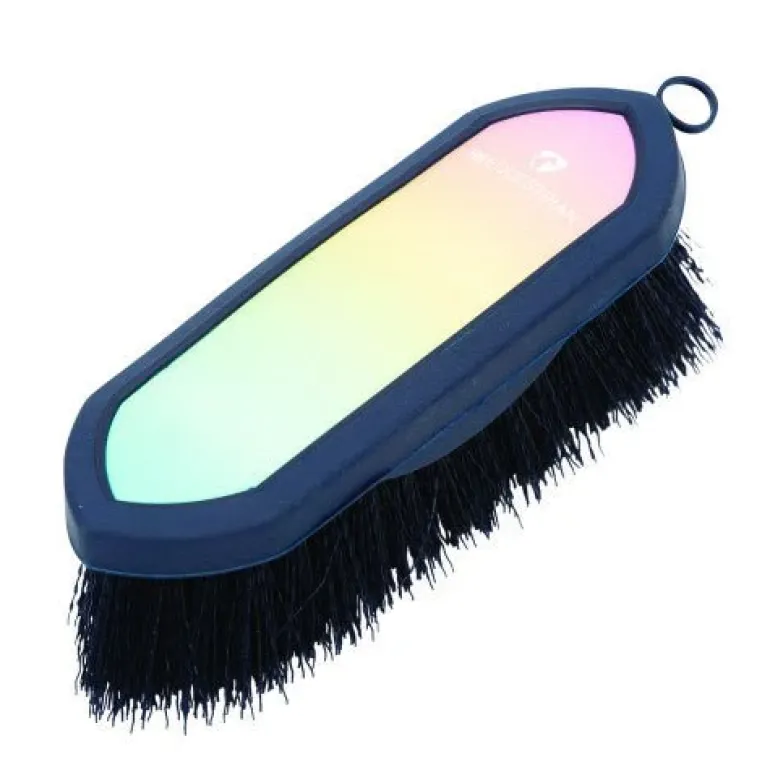 A soft touch navy large oval body brush with stiff PP bristles. Features a faux leather ombre centre with Hy Equestrian logo. Great to use on dirtier areas with stubborn mud.