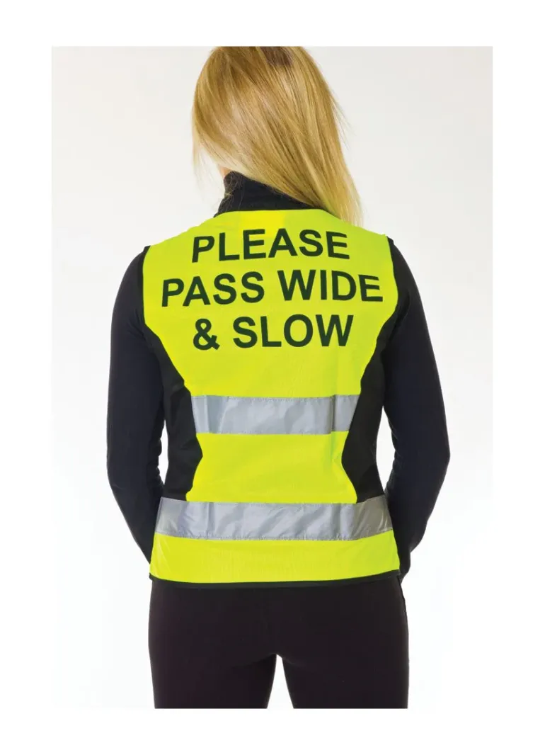 Stylish HyVIZ Waistcoat with PLEASE PASS WIDE & SLOW printed on the back. CE marked. Certified to EN1150. Breathable fabric, with YKK zip fastening to the front and a pocket for your mobile phone. Elegant cut for a flattering fit. Fluorescent with silver reflective tape for style and safety, front and back. All year round visibility. Machine washable at 40ºC.Â