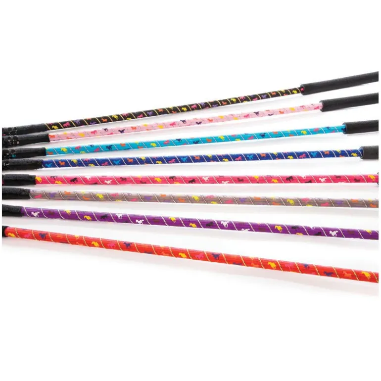 A riding whip featuring a silver spiral shaft and horse print design in a range of colours.