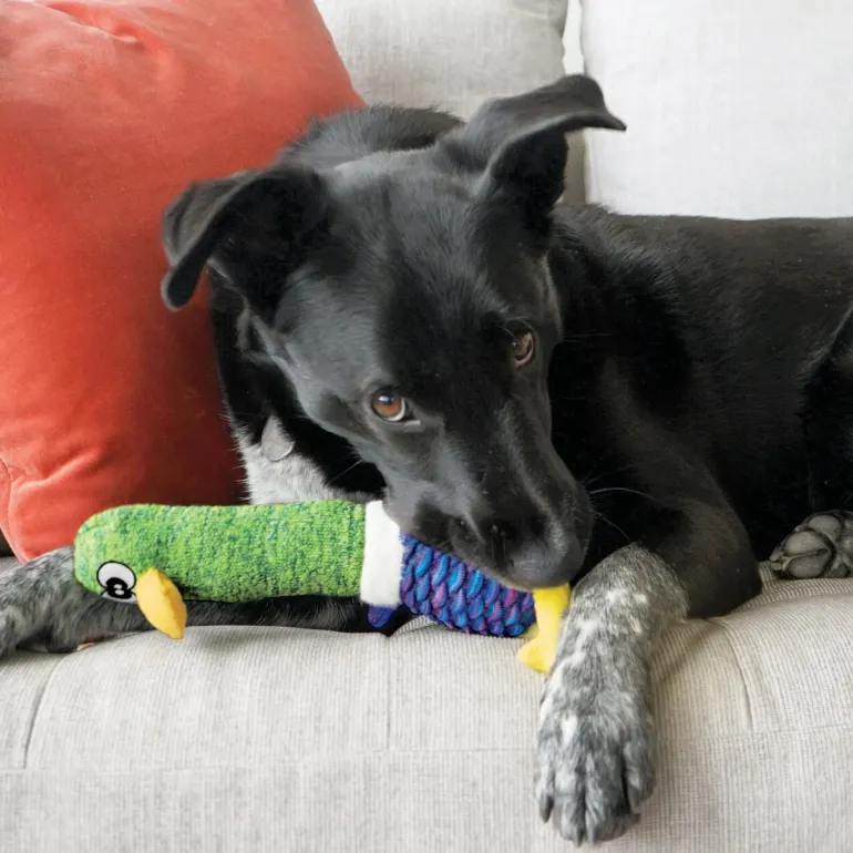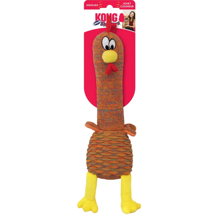 KONG Shakers Cuckoos tennis shoe material entices tugging and shaking instincts adding up to long runs of fun. A full-bodied, low tone squeaker pumps up indoor play sessions while crackle sounds and a long body keep dogs engaged. A flock of playful bird characters and a reinforced liner ensures that playtime lasts.