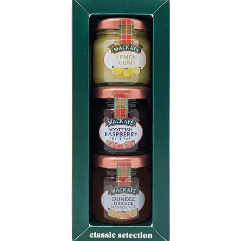 Mackays Classic Selection is a delightful trio of traditional Scottish preserves, perfect for adding a touch of sweetness to breakfast or afternoon tea. This set includes the zesty Lemon Curd, rich Scottish Raspberry Preserve, and the famous Dundee Orange Marmalade, each crafted with care in Scotland. Beautifully packaged, it makes a wonderful gift for food lovers or an indulgent treat to enjoy at home.