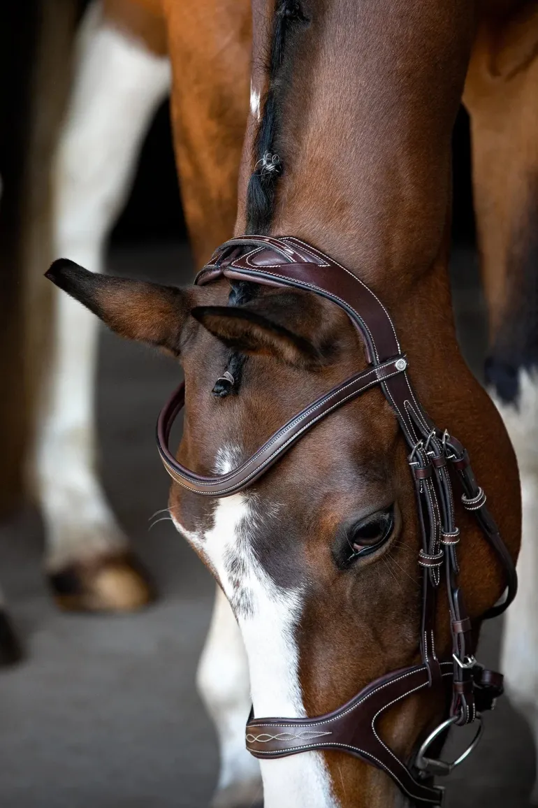 New and innovative ergonomic bridle in black Montar leather and stainless steel buckles. When the comfort of the horse has first priority!