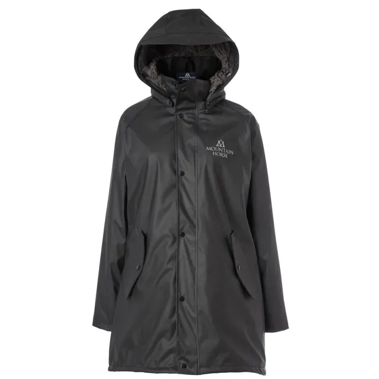This child’s raincoat is fully waterproof, with welded seams and a cozy, soft pile fabric lining. It features large front pockets, a riding slit at the back, and reflective details for added visibility.