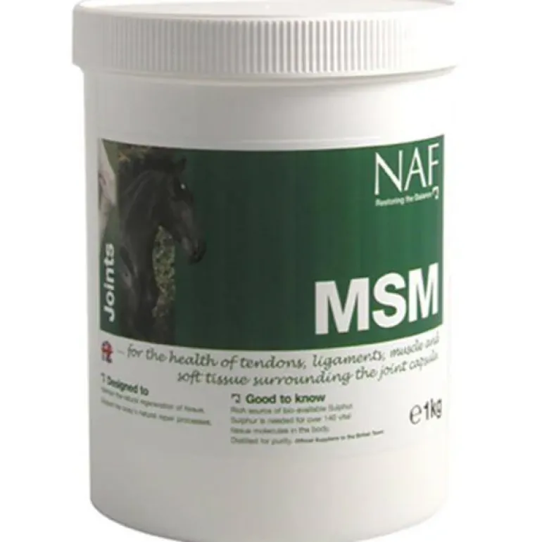 NAF MSM Pure is rich in bio-available sulphur, vital for the health of soft tissue, tendons, ligaments and muscles. Feeding MSM at the recommended rates ensures the correct levels of sulphur are donated to the areas where it is most needed, such as the soft tissue elements of the joint. Feeding Guidelines Horses and Ponies: Loading rate (7 to 10 days): 32g – 40g per day = 4 – 5 scoops per day. Standard maintenance: 8g – 24g per day = 1 – 3 scoops per day. What’s in it Methyl Sulphonyl Methane. Size Guide Available in a 1 Kilogram tub.