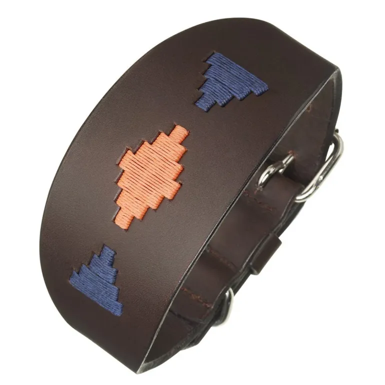 Vibrant burnt orange and navy threads make up this design.This lurcher collar features a paired down version of the original design, with 3 pampa diamond motifs handwoven onto the leather band. This collar is 45cm in length and as with all our lurcher collars, the leather collar band is broad enough to support a slender or long neck, even on an active dog. The small d-ring, which we have added for lead attachments. goes further to ensuring a balance between a sturdy and protective for your canine friend.