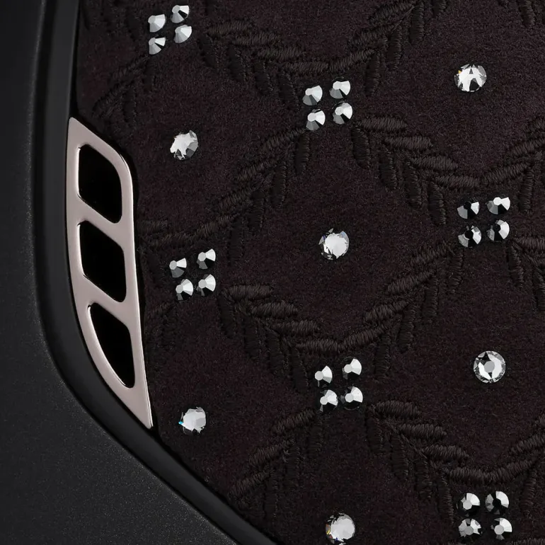 Exquisite materials – polycarbonate, a material found in top-tier motorgear – coupled with an anti-scratch paint give the Shadow Helmet unparalleled form and function. Embedded around the helmet’s contours, up to 300 Swarovski crystals provide a glimmering accent to the signature edging. Advanced ventilation optimizes airflow with this helmet’s 6-point system. Ergonomically designed, the integrated chinstrap offers the perfect fit for all hairdos, including a trainer’s bun. Memory foam ensures a consistent thickness over time, while a semi-rigid chinstrap prevents hazardous tipping. Inside, variable-density polystyrene diffuses energy from impacts, accompanied by a removable comfort foam secured via a reliable clip system. Finally, the foam can be washed at 30°C for a permanently clean and pleasant aroma.
