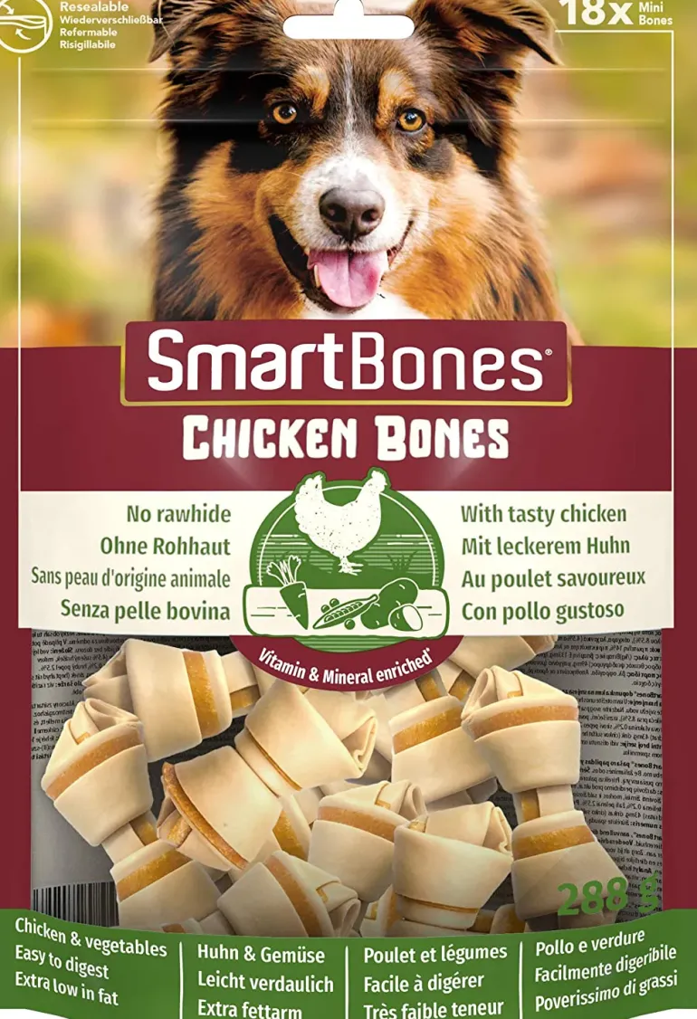 SmartBones have all the benefits of a rawhide chew…WITHOUT the RAWHIDE! SmartBones are made with real chicken and wholesome vegetables for a scrumptious taste dogs can’t resist! These tasty bones are fun to chew as your dog works through the delicious outer layer with vegetables to get to the chicken inside. When chewed, Chicken Bones have a natural abrasive effect that helps to clean your dog’s teeth and supports dental health.