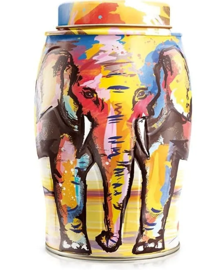 The colours of a hot Savannah, our Painterly Summer elephant gift caddy is all about Kenyan , with red ochre colours and wandering Masai in the background. Complimenting our Painterly Winter elephant gift tea caddy to form a collectable pair.